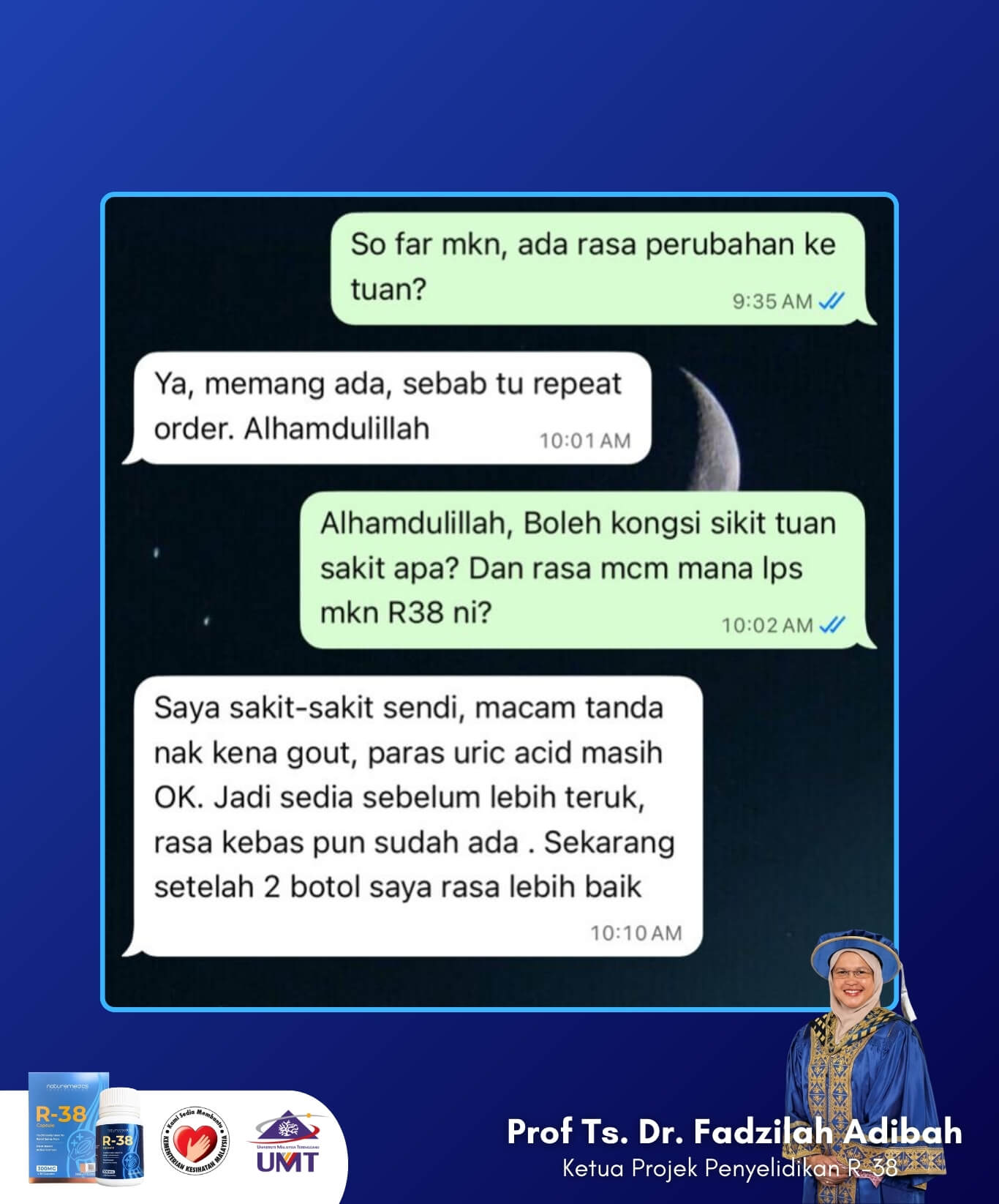 R-38 adalah formulasi herba tempatan yang dibangunkan oleh Prof. Dr. Fadzilah Adibah dari Universiti Malaysia Terengganu selepas lebih 5 tahun kajian saintifik. Ia berfungsi dengan mengurangkan kadar asid urik dalam badan dan melegakan keradangan sendi secara semula jadi. 1 kapsul R-38 bersamaan dengan 3 jenis ubat pesakit gout konvensional, tetapi lebih selamat untuk buah pinggang.